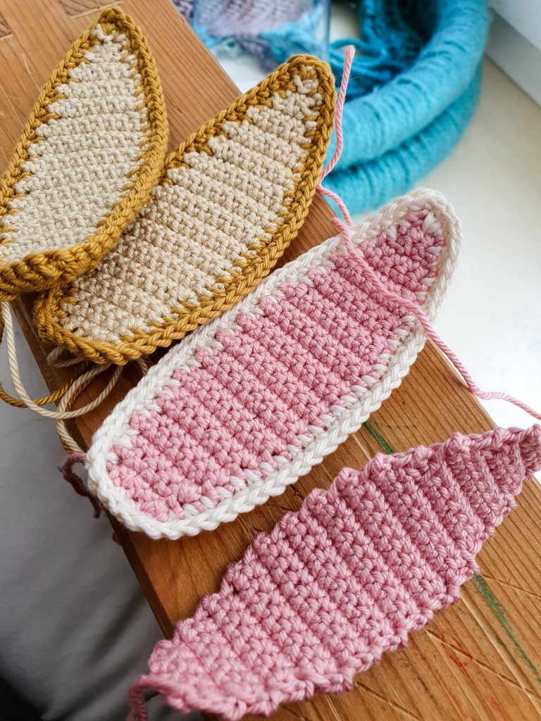 Lege ein Detail in der Kontrastfarbe auf das Detail in der Hauptfarbe und verbinde die Ränder durch beide Details gleichzeitig gehäkelt in der Hauptfarbe mit fM: 28 fM entlang der linken Ohrenseite, 5 fM am unteren Rand, 28 fM an der rechten Ohrenseite, 2 fM in die Ohrenspitze.