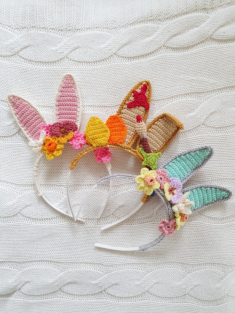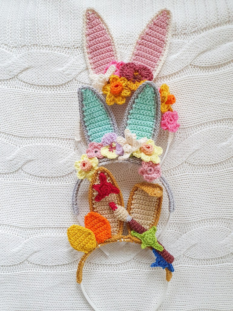 Die Details lassen sich natürlich ganz nach Geschmack auch mixen. So können Blüten und Pinsel an den Haarreif gemeinsam angebracht werden. Oder aber Blüten und zwischendrin versteckt ein oder zwei Ostereier – so richtig österlich! Probiere aus, was dir gut gefällt. Die Öhrchen lassen sich auch ganz wunderbar an einer Ecke etwas knicken. Zum Glück sind alle Details wirklich schnell gehäkelt, so dass du dich mit den verschiedenen Details schnell und einfach austoben kannst. Ganz ohne Öhrchen entsteht ein wunderschöner Blütenhaarreif für besondere Anlässe, das Midsommar-Fest oder z. B. für Blumenmädchen auf einer Hochzeit.