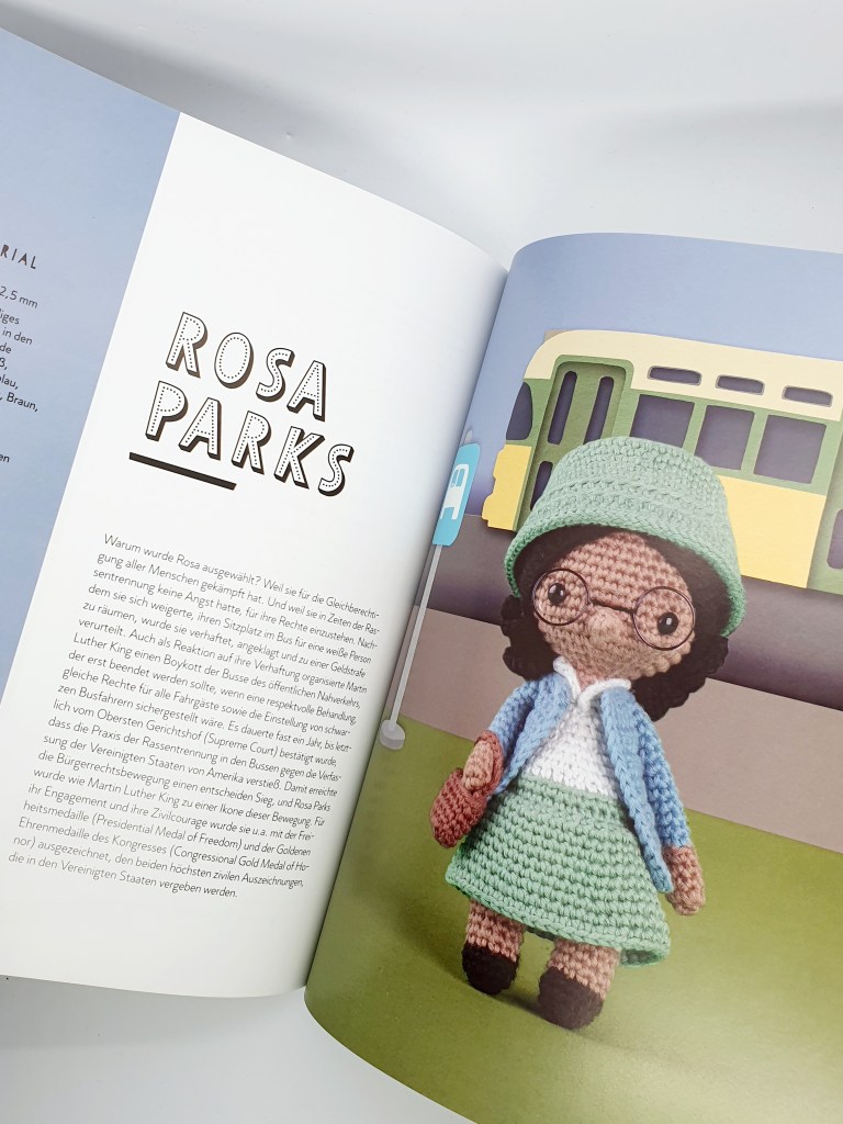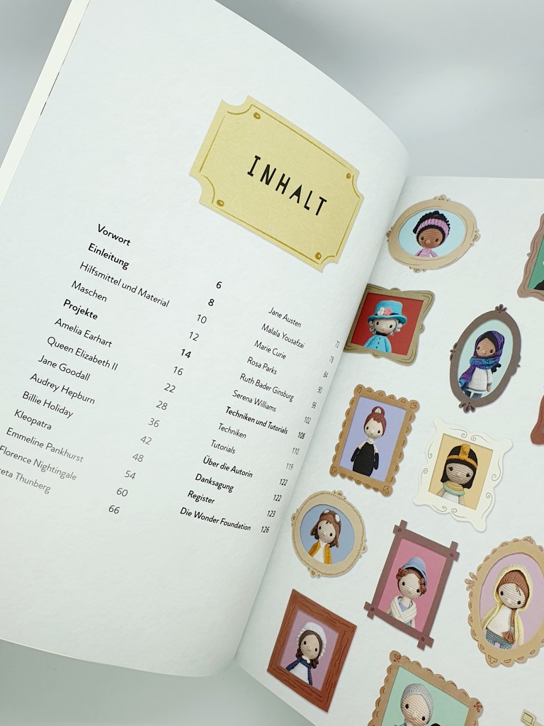 Auf der Buchrückseite erfahren wir zudem, dass wir nicht nur 15 supersüße Amigurumi-Anleitungen (eigentlich 16 – Jane Goodall bringt ihren kleinen Schimpansen Flint mit) mit diesem Buch erhalten, sondern auch einen Einblick in Leben, Arbeit und Vermächtnis der jeweiligen Superfrauen.