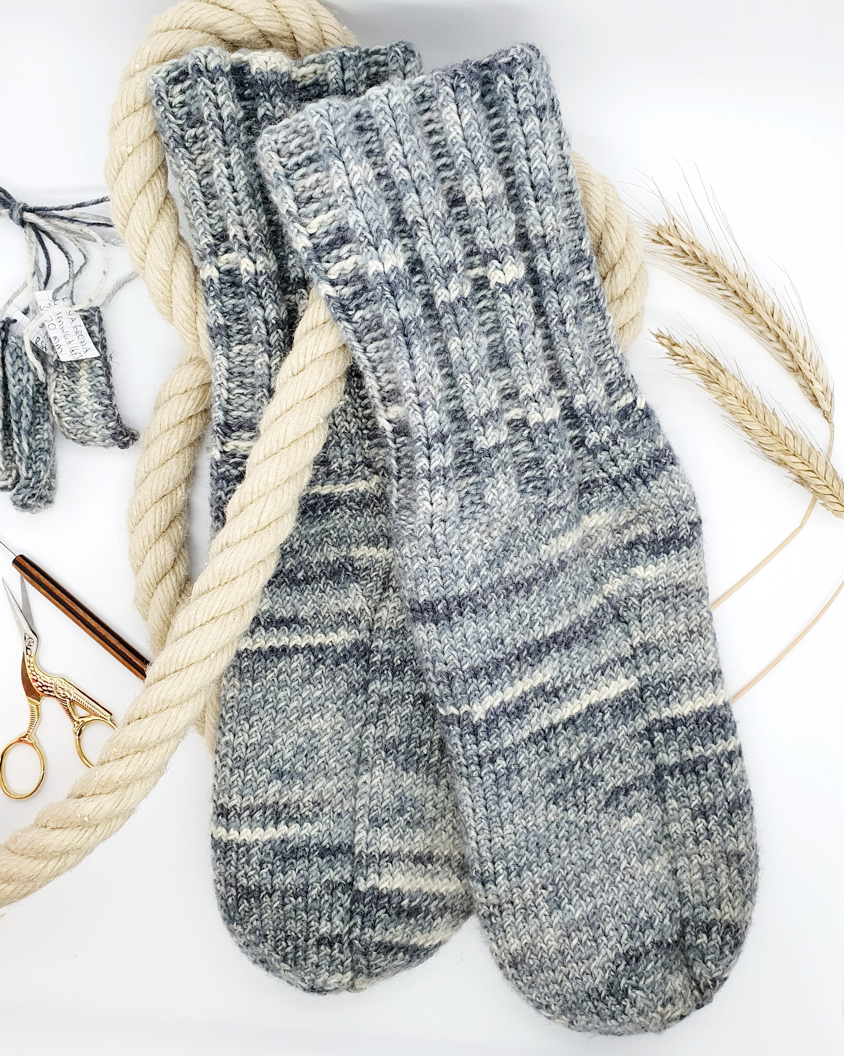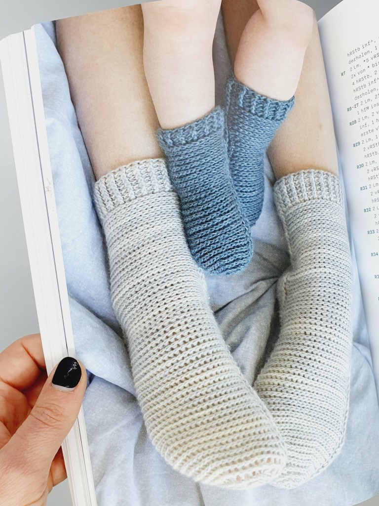 Natürlich werden die gehäkelten Socken durch die Reliefstäbchen etwas dicker. Das war aber z. B. meinem Mann sehr willkommen, der zwar gerne Wollsocken trägt, aber das Problem hat, dass diese sich in seinen schwereren Schuhmodellen oder barfuß leider schnell ins fadenscheinige abgetragen haben. Er trägt seine Socken – mit Waschunterbrechungen, was denkt ihr denn!? – seit gut fünf Monaten und die sonst in der Zeit häufig bereits durchgelaufenen Stellen halten im Langzeittest gut. Außerdem hat die innere Reliefstäbchenstruktur eine sehr angenehme Tragehaptik. Meine Mäuse tragen ihre Socken auch gerne als Ersatz für die Hausschuhe. Wird das Buch also seinem Titel gerecht? Absolut! Meine Familie und ich sind restlos überzeugt von den Reliefstäbchen-Socken und tragen sie wirklich gerne.