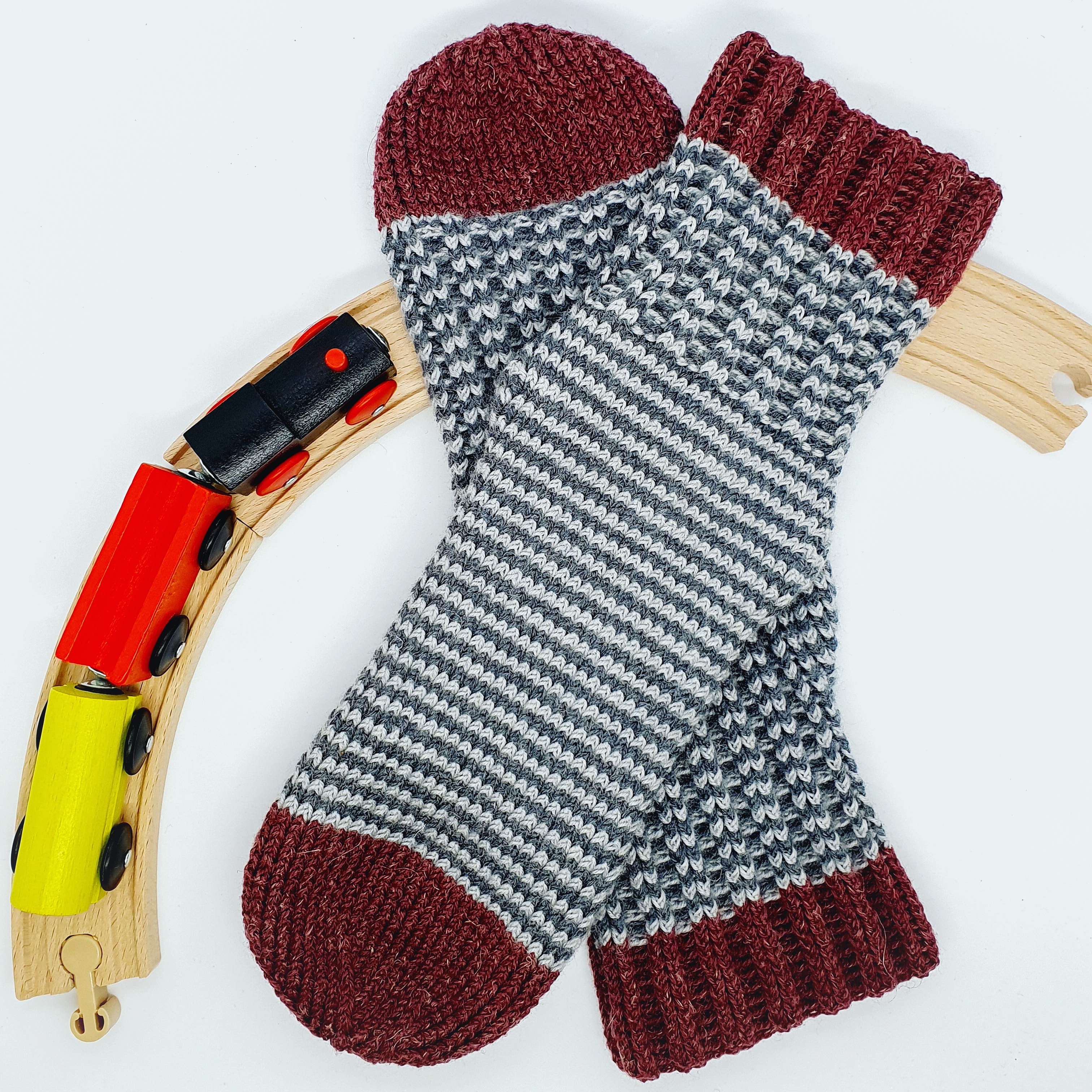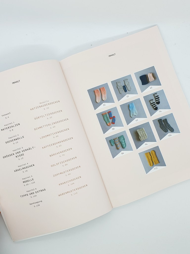 Die Modelle reichen von schlicht (Katzenaugen, Gürteltier, Kranichsocken) über verspielt (Schmetterling, Bärchen), grafisch (Lokomotive, Goldfisch) bis hin zu strukturiert-gemustert (Zopfmuster, Wabenmuster, Kaffeebohnen) und greifen so die beliebtesten Vorbilder aus der Strickwelt auf. Ich finde übrigens die Modellnamen grandios! Die Modelle werden in ansprechenden Bildern gekonnt in Szene gesetzt. Die Bilder geben einen tollen Eindruck, wie verschiedene Modelle in verschiedenen Größen aussehen.
